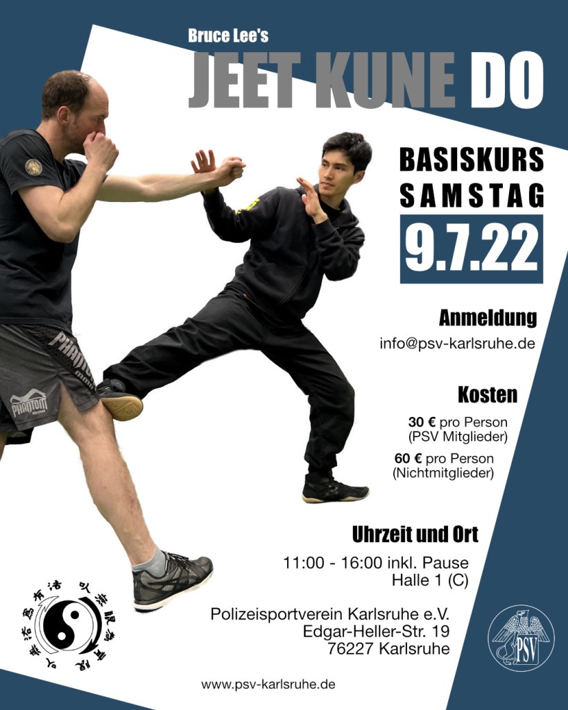 Am Samstag, 9.7.22 bietet der Polizeisportverein Karlsruhe wieder einen neuen Jeet Kune Do Einsteigerkurs an. In diesem vierstündigen Kurs bekommst du einen ersten Einblick in die wichtigsten Grundlagen im Jeet Kune Do. Ein guter Mix aus Theorie, praktischen Übungen und realen Andwendungsbeispielen erwarten dich. Hier kannst du dich direkt online anmelden.