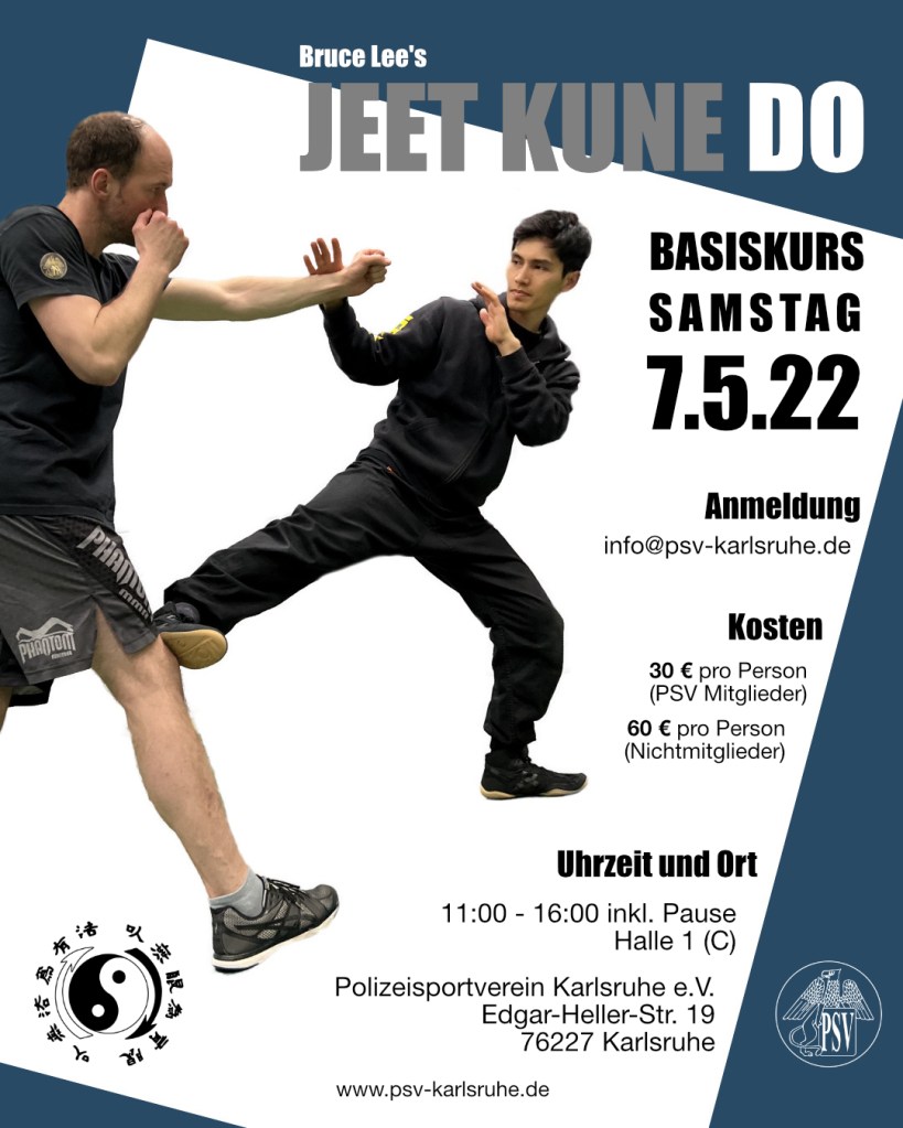 Am Samstag, 7. Mai 2022 gebe ich beim Polizeisportverein Karlsruhe von 11:00 – 16:00 Uhr ein Jeet Kune Do Basiskurs für Anfänger. Dieser Kurs eignet sich sowohl als Einstiegsgrundlage für das reguläre Jeet Kune Do Training im PSV Karlsruhe, sowie auch als reiner Schnupperkurs, um einfach mal Bruce Lees Kampfkunst kennenzulernen.